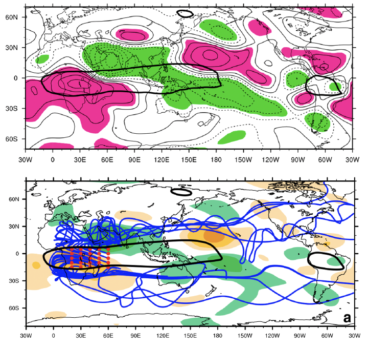 In this study, an interhemispheric teleconnection pattern across the critical latitude from southern Africa through South Asia to the North Pacific was revealed in boreal winter monthly averaged 250-hPa streamfunction fields obtained from both the 40-yr ECMWF Re-Analysis (ERA-40) and the NCEP–NCAR reanalysis data from 1957/58 to 2001/02. Classical Rossby wave theory for zonally varying flow in which the effects of the basic-state meridional wind are ignored predicts that stationary Rossby waves cannot propagate across easterlies. To elucidate the underlying mechanisms responsible for this interhemispheric teleconnection, the theoretical basis for stationary wave propagation across the critical latitude is considered, taking into account meridional ambient flow. The theoretical results suggest that the southerly flow over East Africa, the western Indian Ocean, and South Asia creates a path for the northward propagation of stationary waves across the critical latitude. Stationary wavenumber and group velocity analysis, ray tracing, and simple model experiments applied to nearly realistic boreal winter mean flows confirm that disturbances excited in southern Africa and the western Indian Ocean can propagate across the critical latitude to South Asia through the southerly duct and then continue downstream along the North African–Asian subtropical jet.